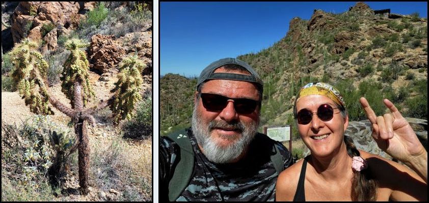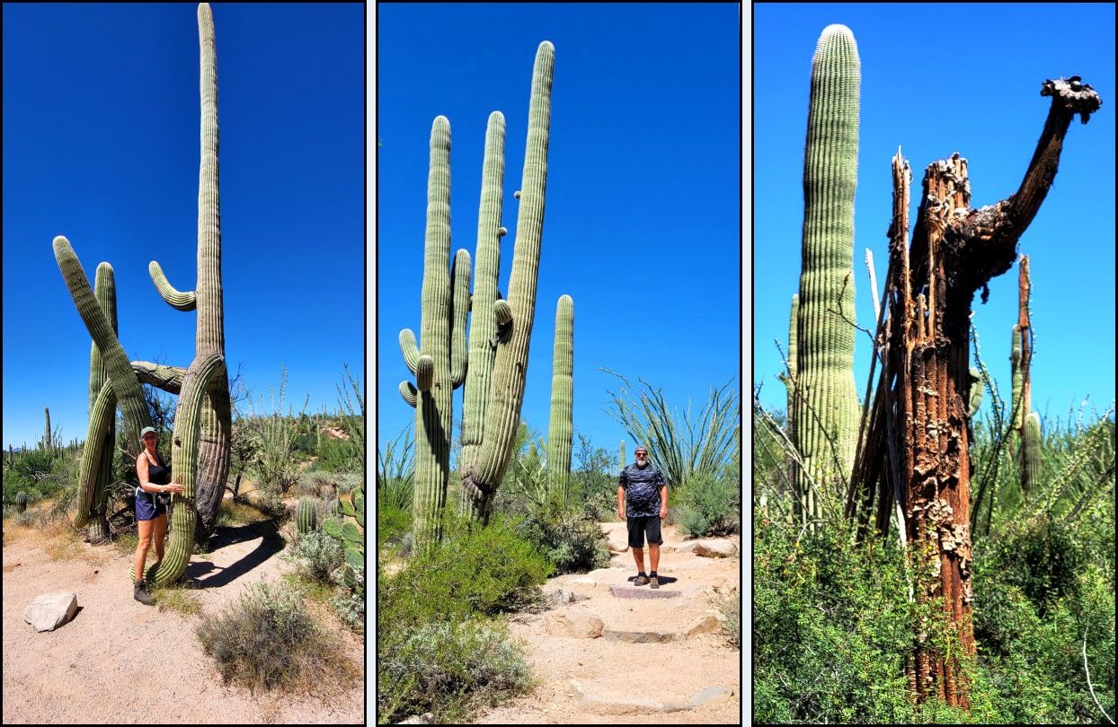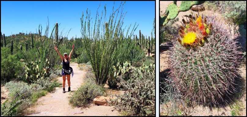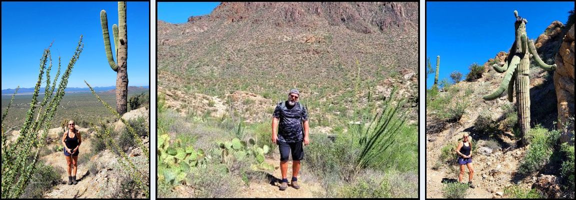 Gut sonnengeschützt schnüren wir die Wanderschuhe und spazieren hier oben zwischen vereinzelten Saguaros umher.