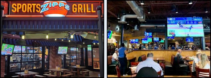 eine große offene Restauranthalle mit mindestens 20 TVs ab 2 m Bildschirmdiagonale.