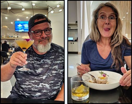 Im Hotel pflanzen wir uns in die große Bar im Atrium und lösen unsere Coupons ein.