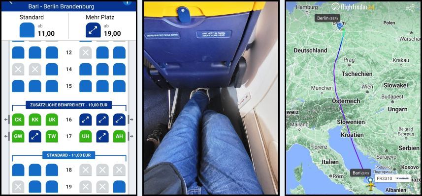 Wir sitzen wieder in den Notausgangsreihen 16 und 17 mit extra Beinfreiheit.