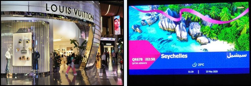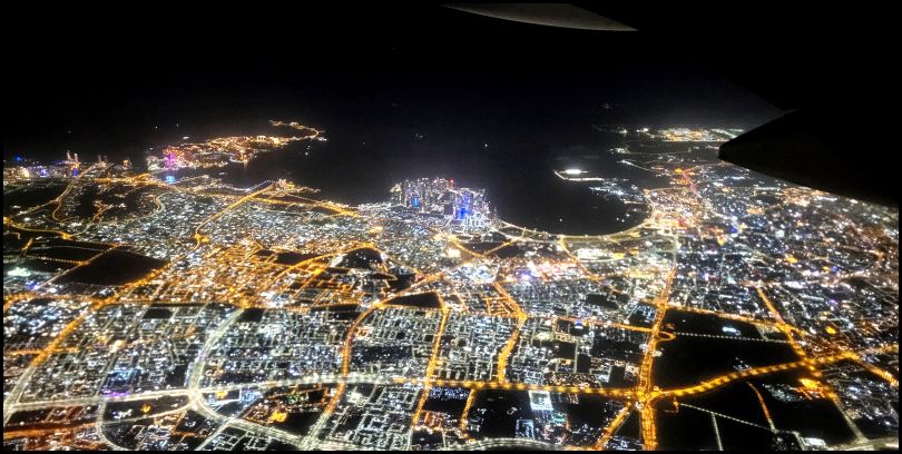 Wir überfliegen das nächtlich beleuchtete Doha, dann gibt es Essen.