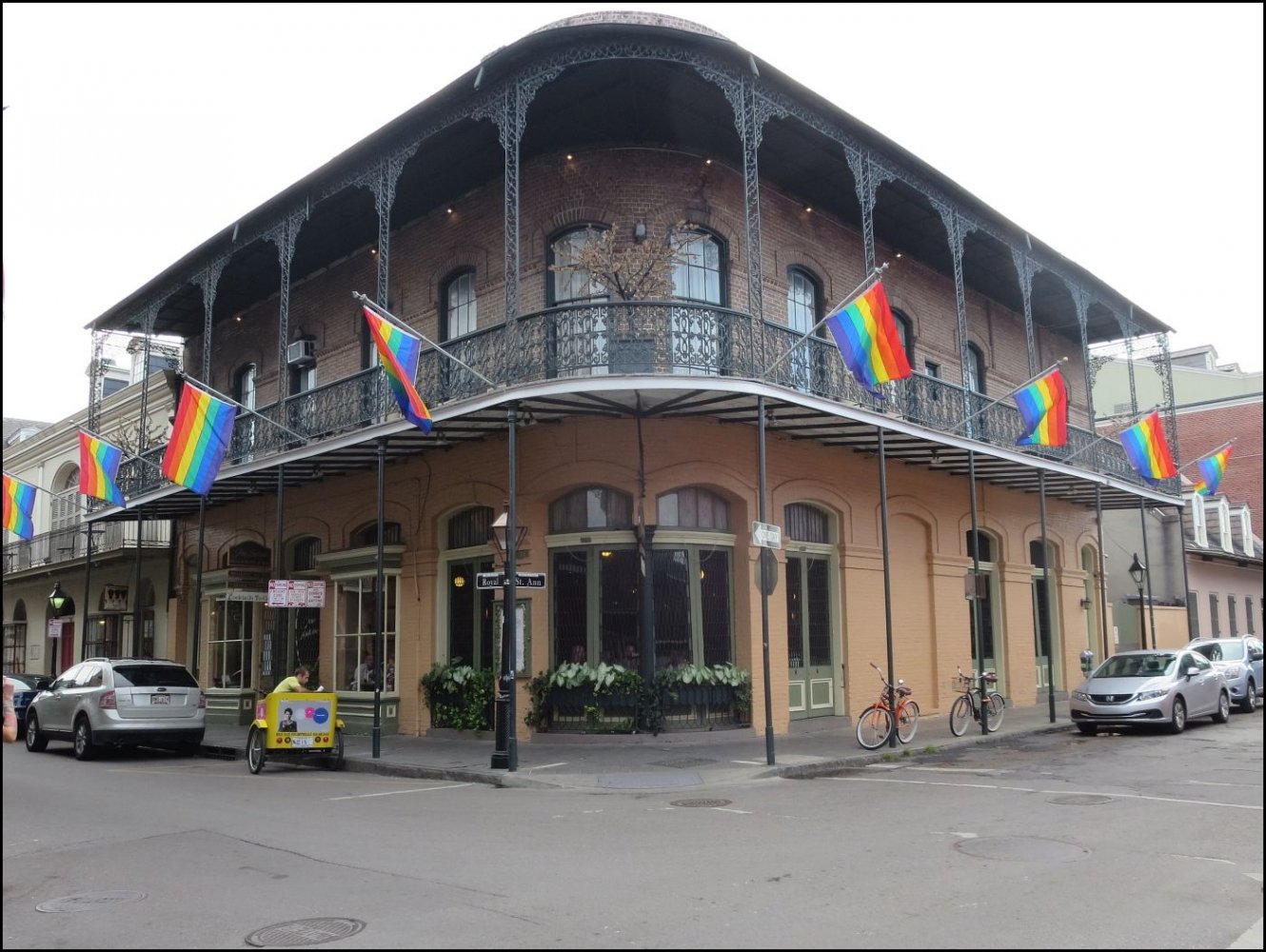 Gegenüber des Harley Store finden wir freie Plätze auf dem Balkon des Le Bayou Restaurants.