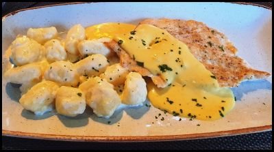 Es gibt Penne Gorgonzola, Salat, Chicken Gnocchi und Mascapone mit Feigen.