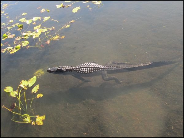 Anhingas breiten ihr Federkleid zum trocknen aus und die überall herumliegenden Alligatoren genießen die Morgensonne.
