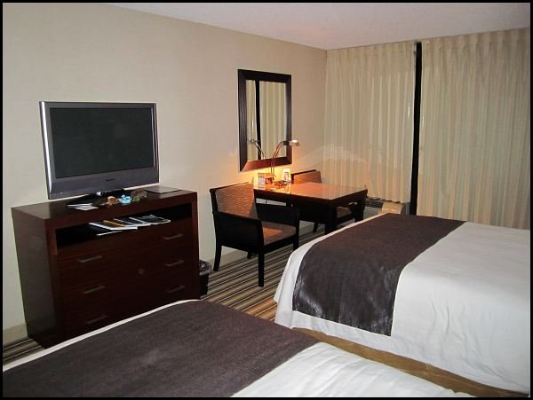 Im Zimmer gibt es die üblichen Drinks, bevor wir die komfortablen, aber ungewöhnlich hohen Queensizebeds besteigen.