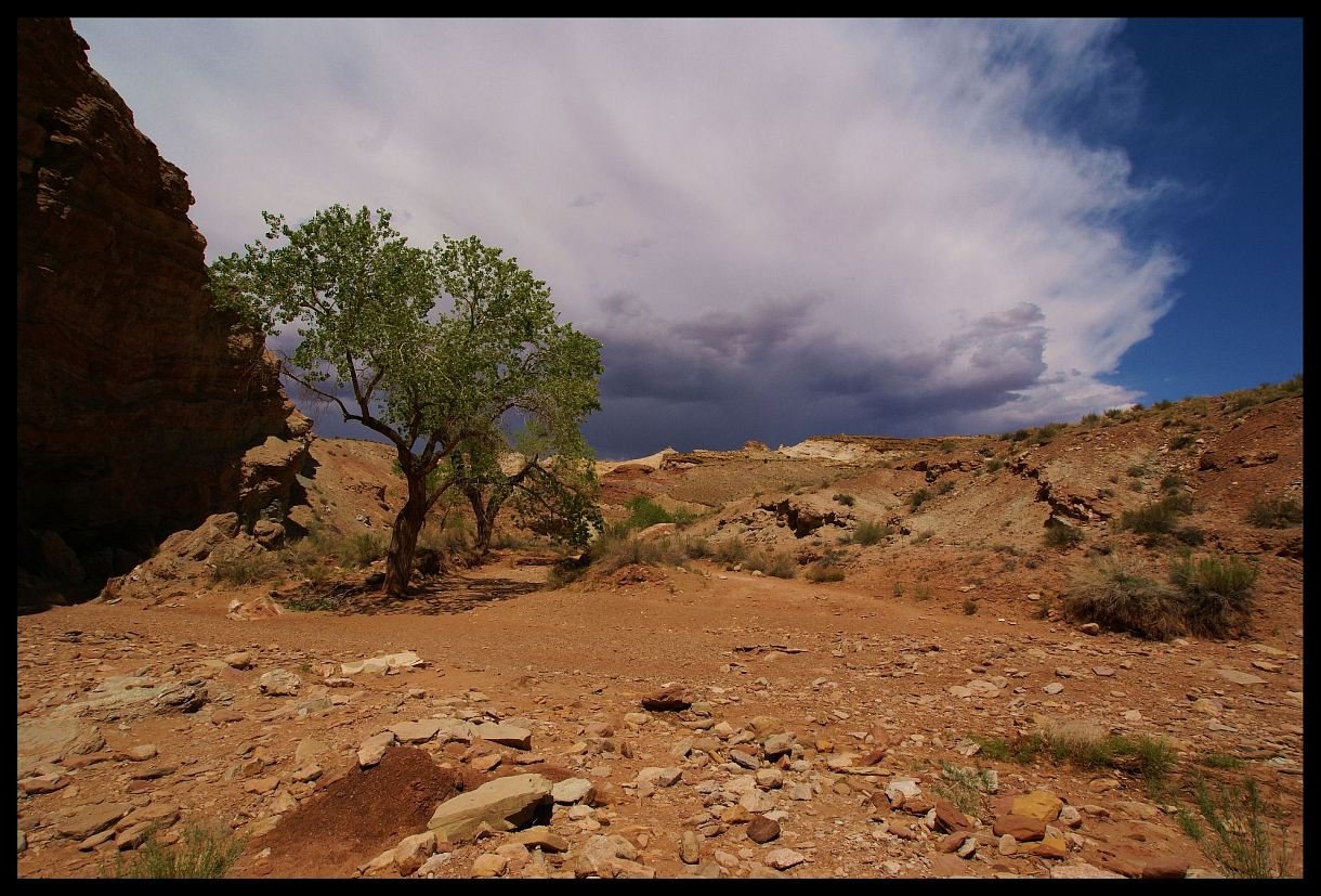 Oberhalb der San Rafael Swell sind dunkle Gewitterwolken aufgezogen.