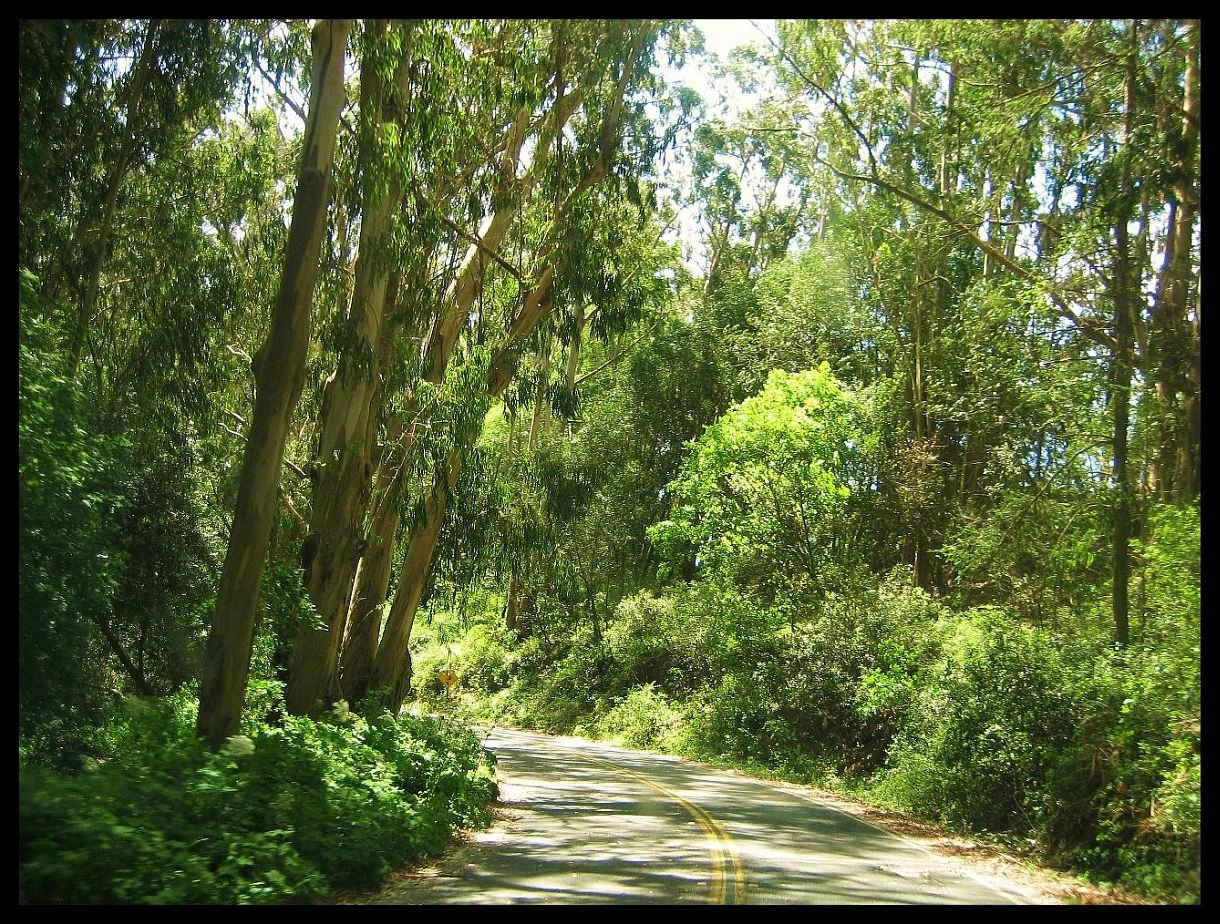 Nachdem wir Olema passiert haben, fahren wir durch dichte alte Eukalyptuswälder.